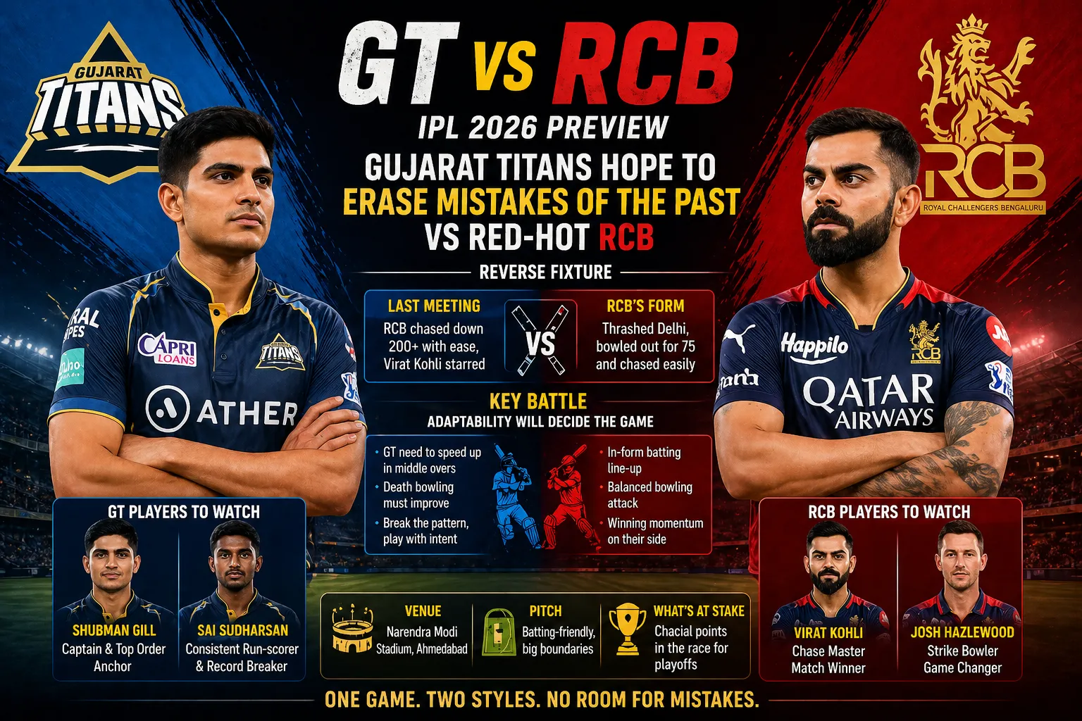 The GT vs RCB clash in IPL 2026 is shaping up as a defining encounter—not just for the points table, but for what it represents in modern cricket.